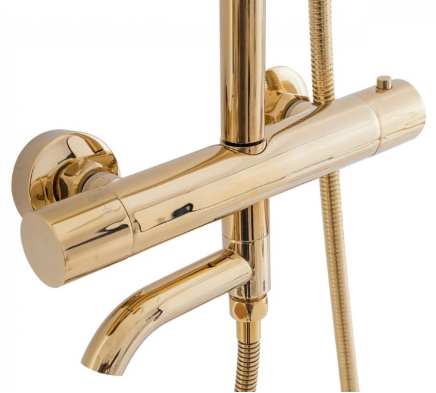 Эта душевая система может включать в себя различные режимы струи для персонализированного комфорта, удобный душевой гарнитур и термостатический смеситель для точной регулировки температуры воды. Золотистая отделка добавляет роскоши и блеска, делая душевую систему не только практичной, но и визуально впечатляющей.