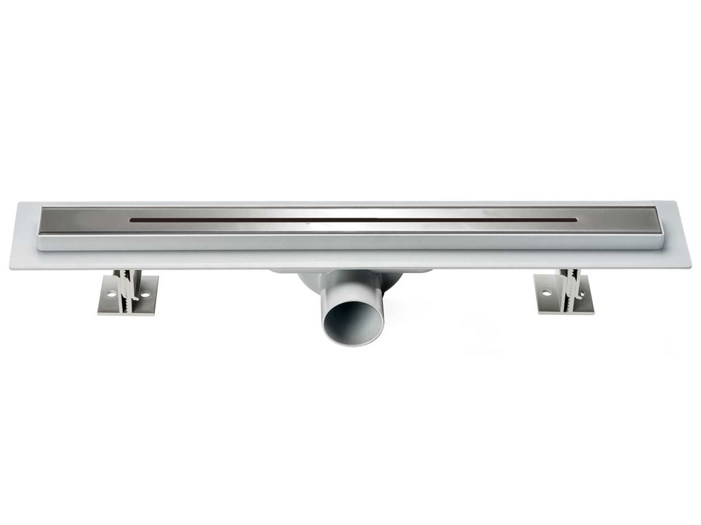 Поворотный сифон 360 градусов из ABS-пластика, дренажный канал из ABS-пластика, водонепроницаемые уплотнительные кольца, решетка и рамка из нержавеющей стали 1 мм, противозапаховый затвор, водонепроницаемая мембрана, пластиковый сервисный ключ, комплект регулируемых по высоте опор