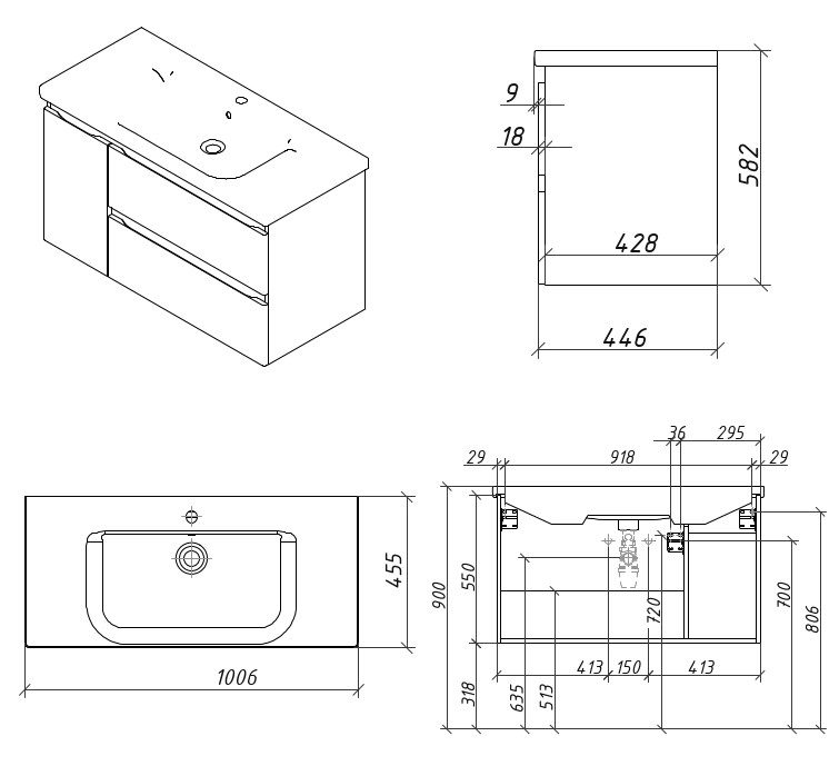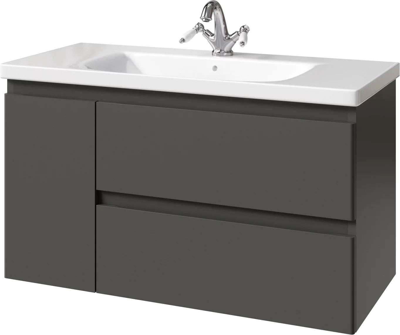 Тумба подвесная для раковины 100см с 2 ящиками и 1 дверью (слева). Ручки интегрированные в фасадах. Выпускается в Матовых и Текстурированных отделках из реестра MODERN (ограничение по глянцевым отделкам).