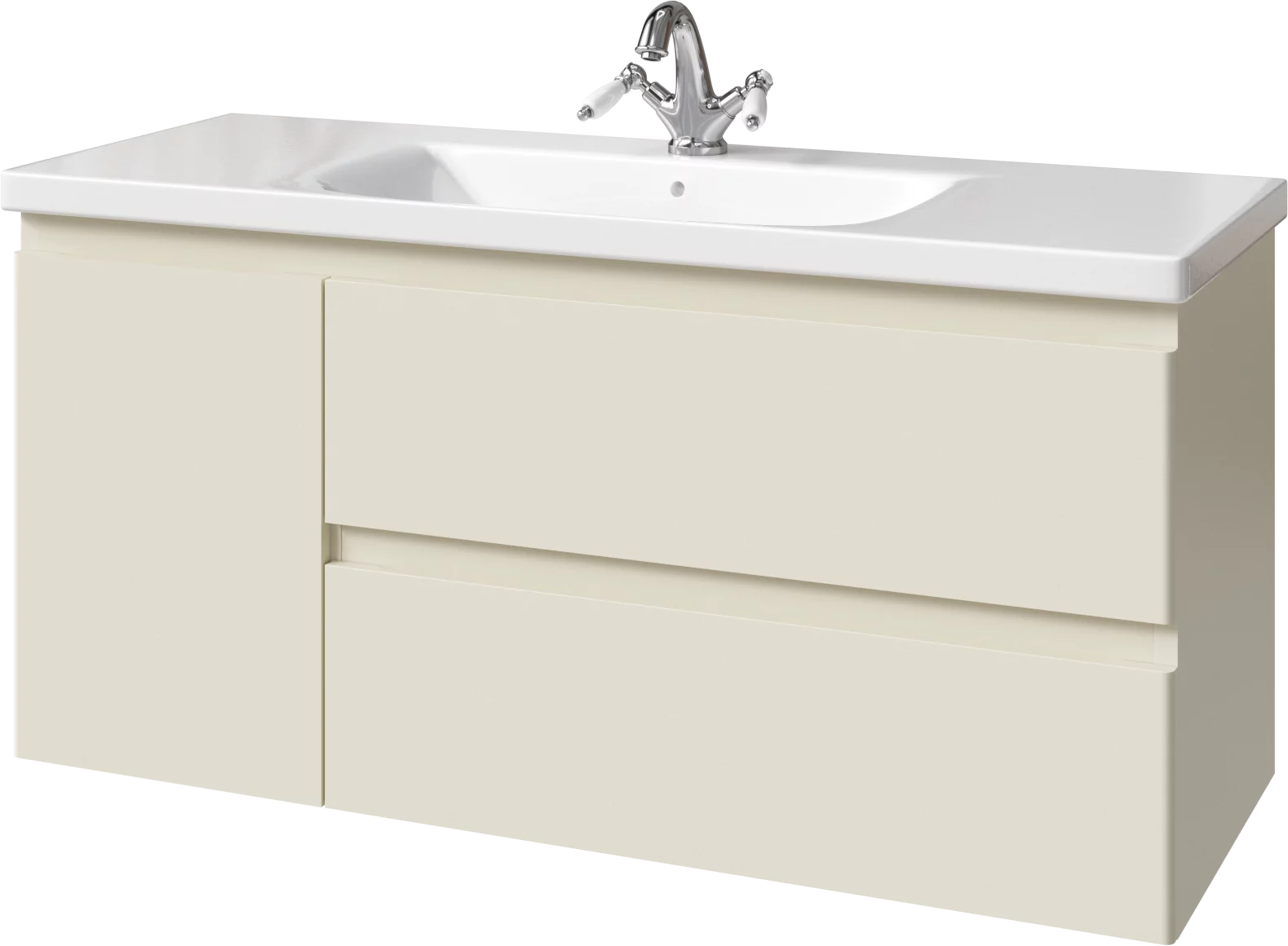 Тумба подвесная для раковины 120 см с 2 ящиками и 1 дверью (слева). Ручки интегрированные в фасадах. Выпускается в Матовых и Текстурированных отделках из реестра MODERN (ограничение по глянцевым отделкам).