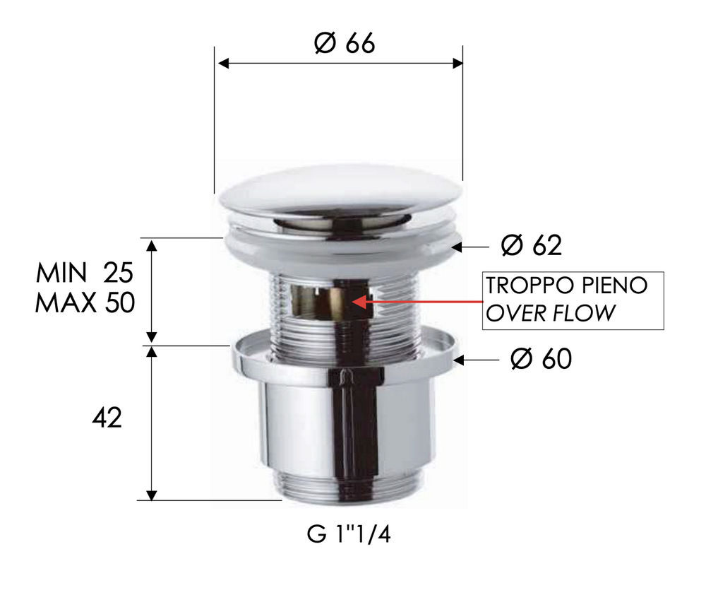 Донный клапан с переливом 1”1/4 Remer 905CC2114XV, сталь
