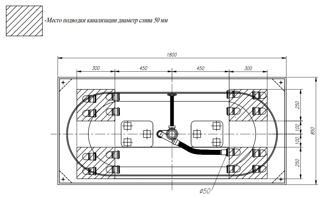 Ванна поставляется в собранном виде на подиуме с автоматическим сливом клик/клак.